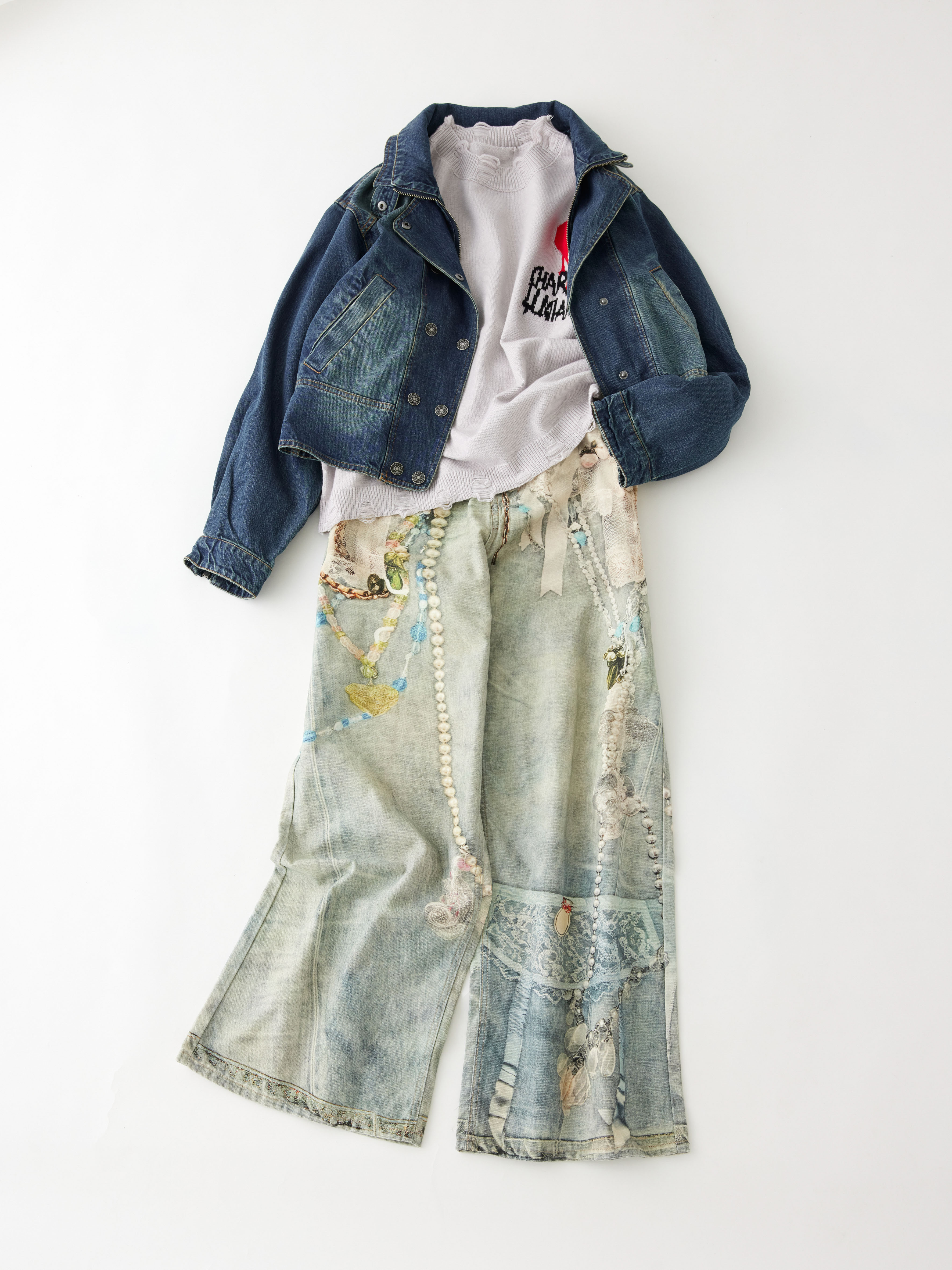 251011 la primaveraチャンネル チャンネル登録はこちらから 使用アイテム ライダース風デニムジャケット 37,900円(税込) USED風ロゴハートニット 12,800円(税込) パールデコレーションフェイクプリントワイドデニム 16,800円(税込) バイカラーレイヤード風プルオーバー 6,900円(税込) コーディネート